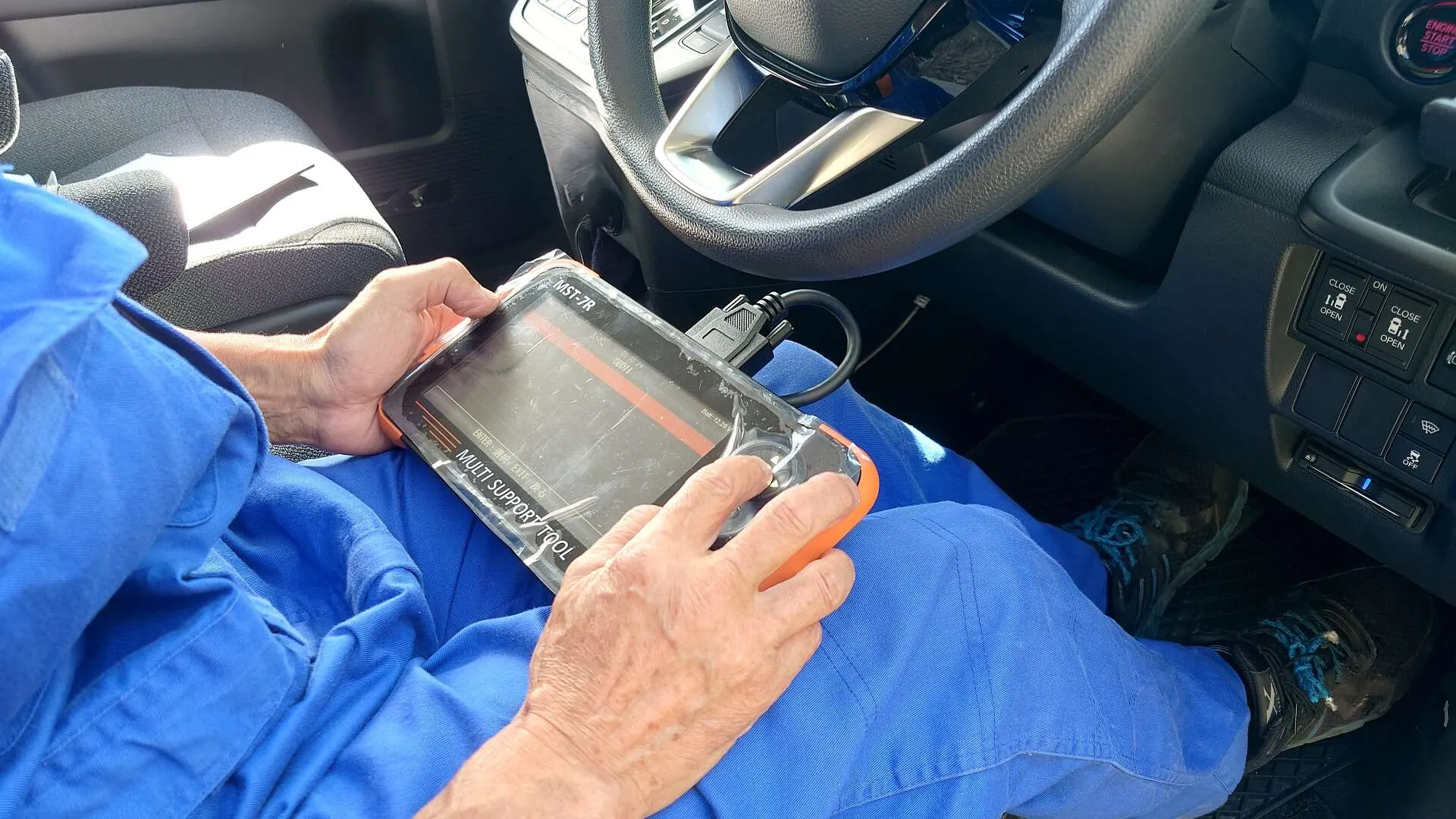 検査員がステップワゴンとOBD検査用のスキャンツールを接続し、検査を進めていきます。