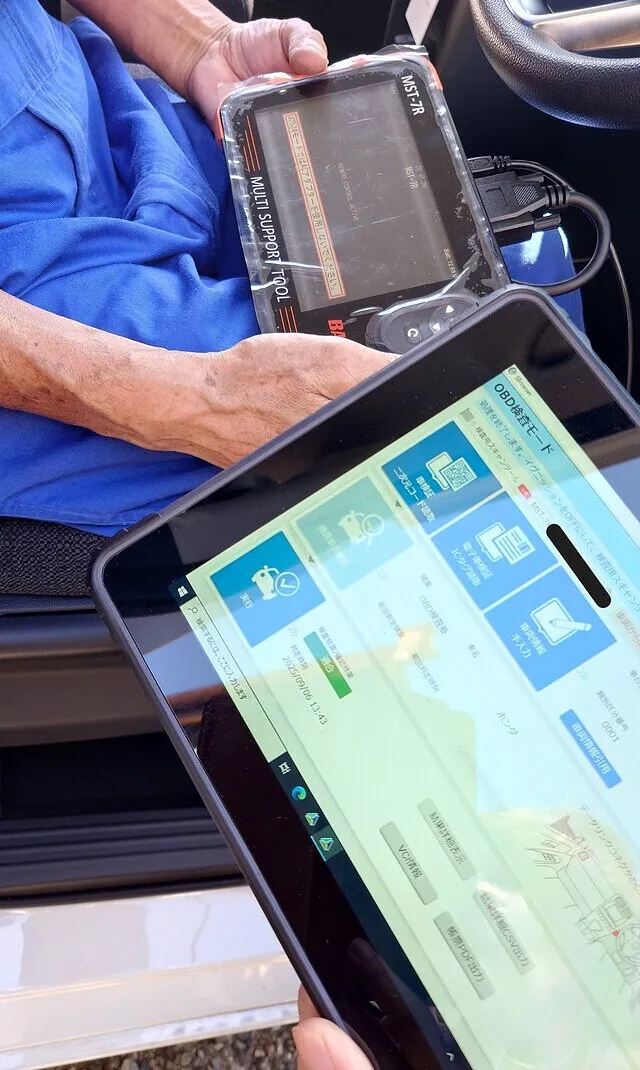 当組合では、検査用スキャンツールと、特定DTC照会アプリをダウンロードしたiPadを使用して検査をしています。